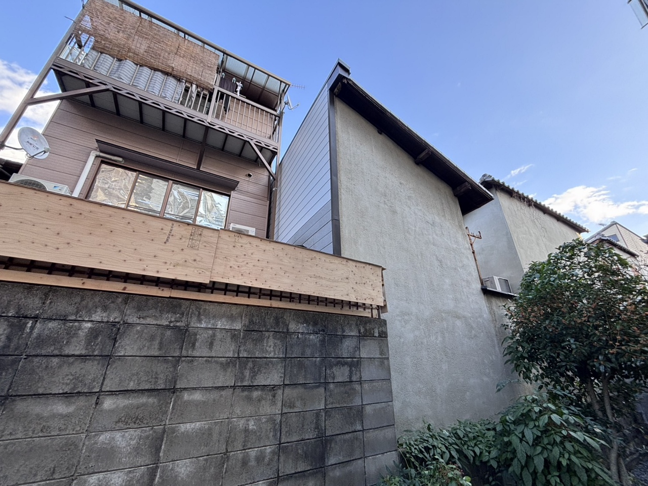 サイディングと下地の隙間には、ノシ瓦が挟まっていた事から、片流れ屋根の瓦葺き替え工事一緒にさせて頂きました。お隣と建物が隣接しているので、見えている所のみ立ち起こし、サイディング張り工事をさせて頂きました。これで当分は大丈夫です。
