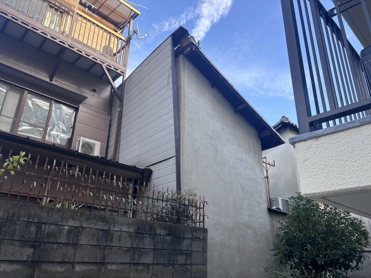 サイディングと下地の隙間には、ノシ瓦が挟まっていた事から、片流れ屋根の瓦葺き替え工事一緒にさせて頂きました。お隣と建物が隣接しているので、見えている所のみ立ち起こし、サイディング張り工事をさせて頂きました。これで当分は大丈夫です。