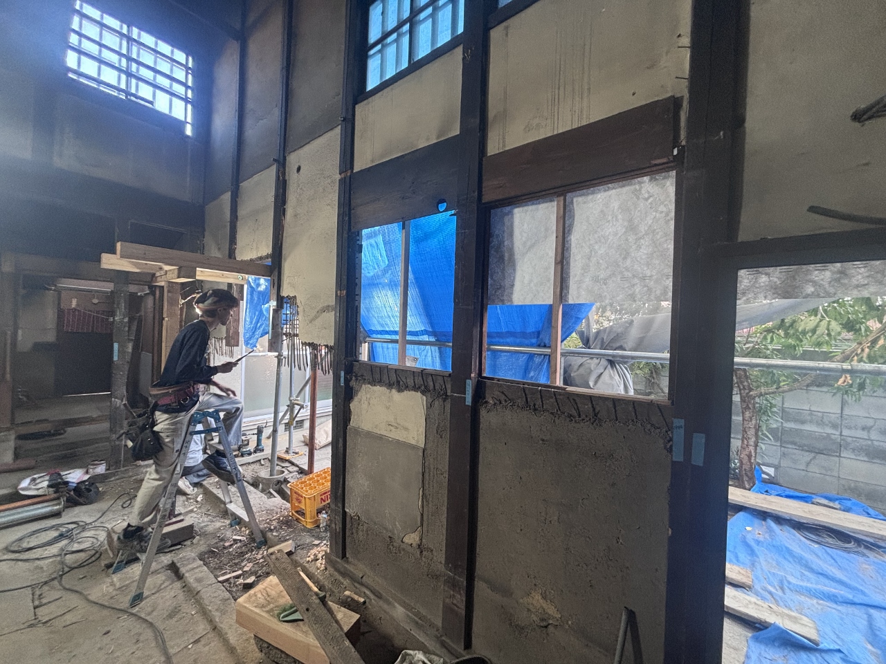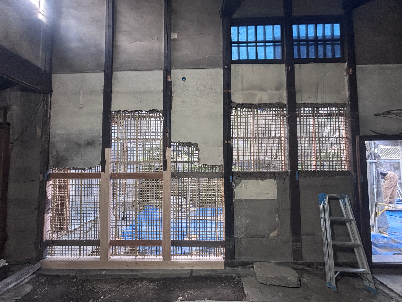 現在改修工事をさせて頂いています、建物表側の柱です。以前はモルタル外壁の中にあり、姿を見せませんでしたが、次のプランでは写真の柱は化粧で見えてきます。